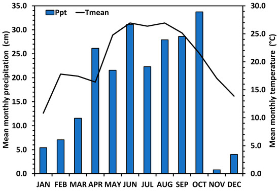 Mean monthly temperature (Tmean) and precipitation (Ppt) for the study site during the sample period that extended from March 2020 to February 2021 (see Materials and Methods).