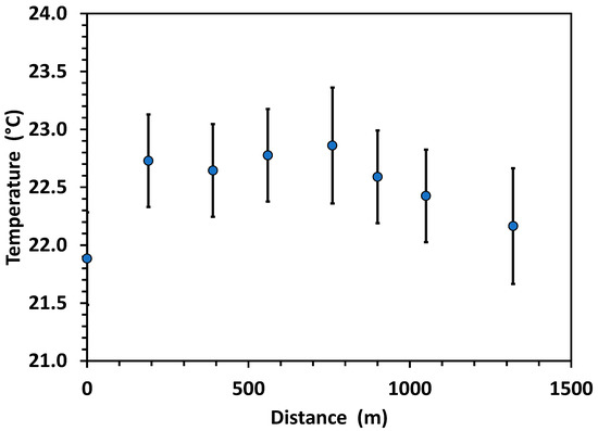 Mean temperature (±1 SE) as a function of distance along the sample transect (see Figure 1). The mean temperature did not vary significantly at p < 0.05.