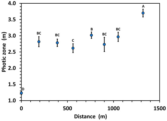 Mean photic zone depth (±1 SE) as a function of distance along the sample transect (see Figure 1). Means with the same letter are not significantly different at p < 0.05.