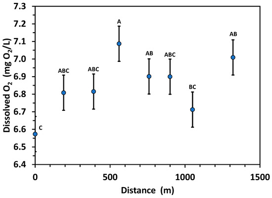 Mean dissolved O2 (±1 SE) as a function of distance along the sample transect (see Figure 1). Means with the same letter are not significantly different at p < 0.05.