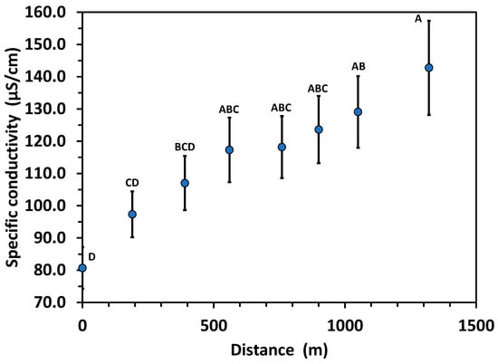 Mean specific conductivity (±1 SE) as a function of distance along the sample transect (see Figure 1). Means with the same letter are not significantly different at p < 0.05.