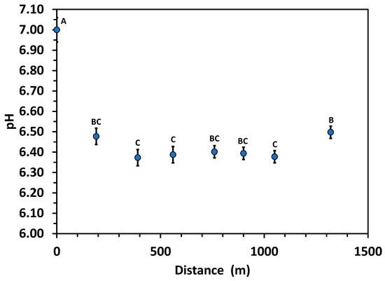 Mean pH (±1 SE) as a function of distance along the sample transect (see Figure 1). Means with the same letter are not significantly different at p < 0.05.