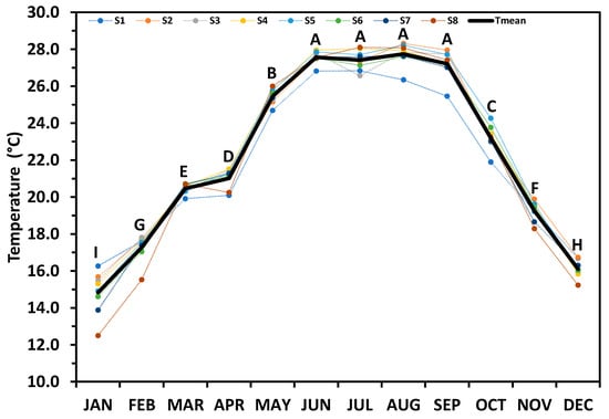 Monthly mean water temperature for all sites combined (heavy black line). Means with the same letter are not significantly different at p < 0.05. Shown also are monthly means for individual sites (S1–S8).
