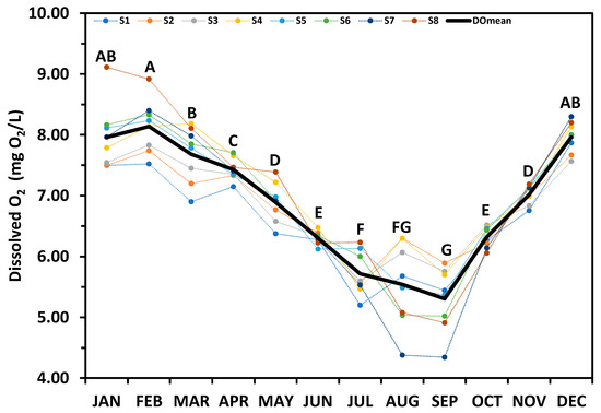 Monthly mean dissolved O2 for all sites combined (heavy black line). Means with the same letter are not significantly different at p < 0.05. Shown also are monthly means for individual sites (S1–S8).