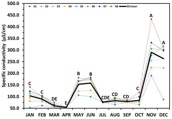 Monthly mean specific conductivity for all sites combined (heavy black line). Means with the same letter are not significantly different at p < 0.05. Shown also are monthly means for individual sites (S1–S8).