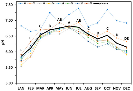 Monthly mean pH for all sites combined (heavy black line). Means with the same letter are not significantly different at p < 0.05. Shown also are monthly means for individual sites (S1–S8).
