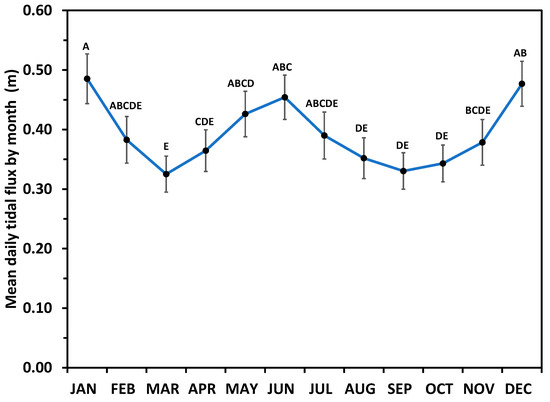 Mean daily tidal flux (±1 SE) by month during the study period. Means with the same letter are not significantly different at p < 0.05.