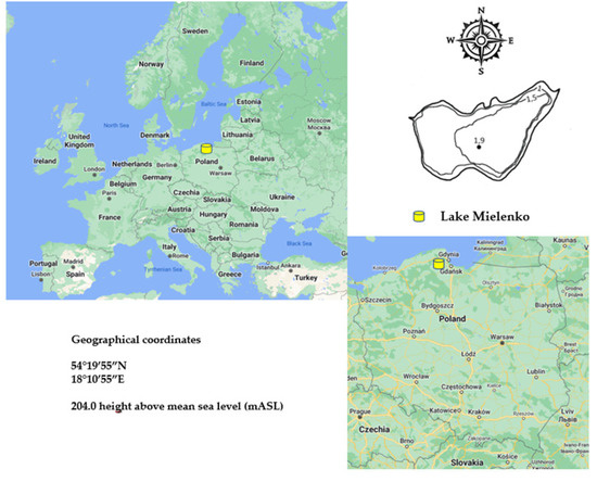 Lake Mielenko is located in the Kashubian Lake District, which is the westernmost part of Pomerania [21]. The lake area is 7.8 ha (Table 1). It is a very shallow water body with a maximum depth of only 1.9 m and an average depth of 1.3 m (Figure 1).