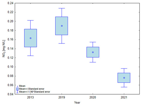 In the selected research years, the concentrations of nitrate nitrogen in the waters of Lake Mielenko were subject to significant fluctuations and varied in the range from 0.000 to 0.332 mg N/L. During the growing season, the concentrations even dropped to the analytical zero. In 2013, during inflow of stormwater before changes of the use of catchment area an average concentration of NO3 in the water was 0.163 ± 0.068 mg N/L (Figure 2). After the creation of a road salts disposal area, an average concentration of NO3 in water decreased to 0.076 ± 0.036 mg N/L in 2021.