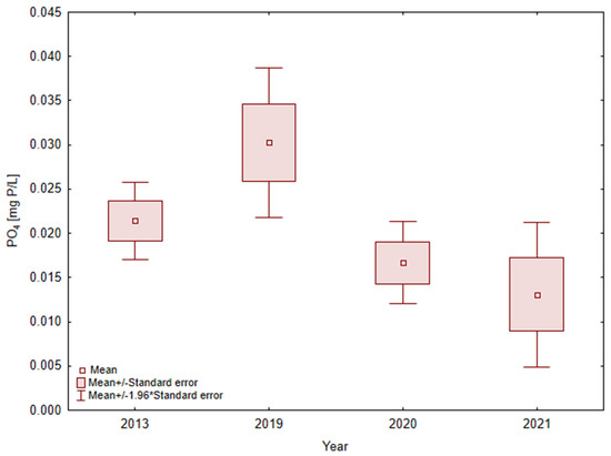 During the research period, phosphate concentrations varied from 0.020 to 0.065 mg P/L. In its occurrence, seasonal variability was found, which consisted of a decrease in concentrations during the period of increased photosynthesis. Before changes of the use of catchment area (2013) mean quantity of phosphates in water of lake was 0.021 ± 0.008 mg P/L (Figure 3). In 2021, the mean values of PO4 decreased to c.a. 0.013 ± 0.014 mg P/L.