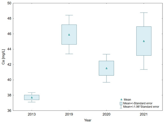 Calcium concentrations in the water of Lake Mielenko ranged from 32.8 to 57.1 mg Ca/L. Seasonal changes in the occurrence of this metal consisted of a clear decrease in concentration in the summer months, in the period of increased primary production. In 2013, when the storm water inflowed without contaminants from the road salts disposal area, the average calcium content in the lake water was 37.7 ± 1.1 mg Ca/L, while in 2021 this value was 45.1 ± 6.5 mg Ca/L (Figure 4).