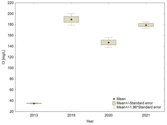 In 2013, when only stormwater was discharged into Lake Mielenko, chloride concentrations varied within a very small range, from 33 to 37 mg Cl/L. After the creation of a road salts disposal area, chloride concentrations in water increased dramatically and ranged from 128 to 221 mg Cl/L. In 2013, the average concentration of Cl in the water was 35 ± 1.6 mg Cl/L (Figure 5). After the creation of the road salts disposal area, the average concentration of Cl in the water increased to 179 ± 10.1 mg Cl/L in 2021.