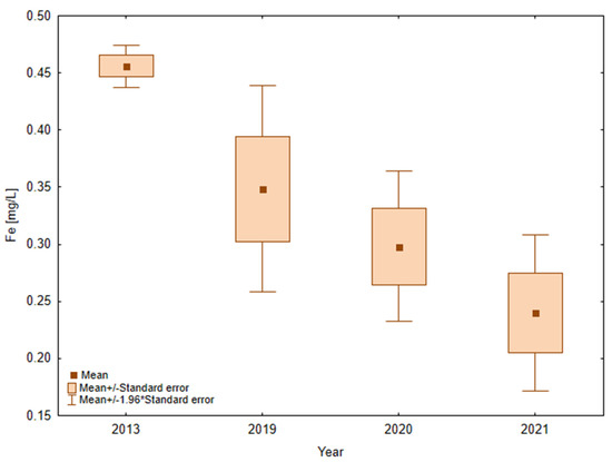 The iron content in the waters of Lake Mielenko varied in the range from 0.13 to 0.78 mg Fe/L. In the last research years, clearly higher concentrations occurred in summer, in July. Before changes of the use of the catchment area (2013), the mean quantity of iron in the water of the lake was 0.455 ± 0.032 mg Fe/L (Figure 6). In 2021, the mean values of Fe decreased to c.a. 0.240 ± 0.120 mg Fe/L.