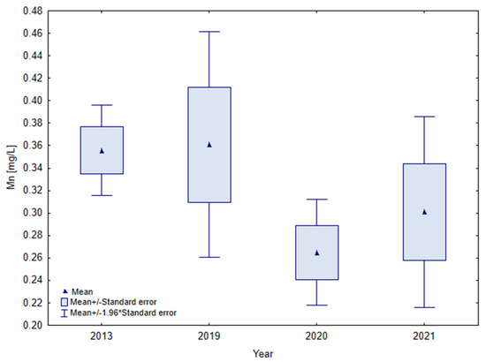 In the water of Lake Mielenko, manganese concentrations fluctuated in the range of 0.14 to 0.74 mg Mn/L. After the creation of a road salts disposal area, manganese concentrations in the water did not change significantly. In 2013, the during inflow of stormwater before changes of the use of the catchment area, the average concentration of Mn in the water was 0.35 ± 0.07 mg Mn/L (Figure 7). In 2021, the average concentration of Mn in the water was 0.30 ± 0.15 mg Mn/L.