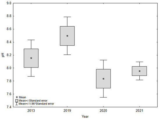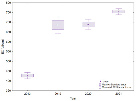 The EC of the water of Lake Mielenko ranged from 382 to 794 µS/cm. In 2013, the average value of the reaction was 427 ± 27.8 µS/cm, while in 2021, a few years after the change of the catchment area management, the mean value of the EC was 754 ± 27.5 pH (Figure 9).