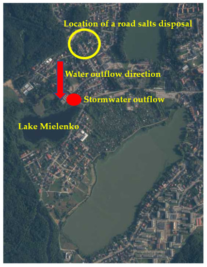 In 2015, a road salts disposal area was created. The salts used are NaCl salt; road salt being a mixture of NaCl and CaCl2 and K2Fe (CN)6—potassium ferrocyanide added to prevent salt agglomeration; and brine composed of CaCl2 and MgCl2. The inflow of storm water from the road salts disposal to Lake Mielenko caused a radical change in the water chemistry of this small and shallow water body.