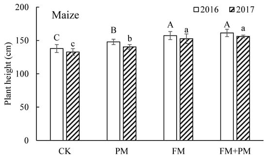 The maize height in two growing seasons is presented in Figure 4. For each season, plants were much taller under the FM+PM, PM, and FM treatments than that under CK treatment. There was no significance between the FM+PM and FM treatments, but they were significantly taller than that under PM and CK treatments. The plant height in the growing season of 2016 was higher than that in the growing season of 2017 under the corresponding treatment, This may be related to the higher rainfall in 2016 than in 2017 (Figure 1).
