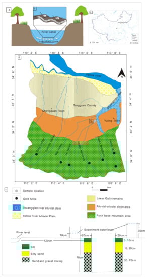 The Shuangqiao River in the Xiaoqinling gold mining area is a typical area of mercury pollution [,]. Xu et al. [] studied mercury pollution in the sediment. The soil content is significantly higher than that of the three geochemical landscapes: the piedmont alluvial-proluvial slope, the loess gully residual plateau, and the Huangwei River alluvial plain; the accumulation or pollution of heavy metals caused by mining activities becomes the soil Hg, Pb, Cd, Cu, and Zn in the study area. Owing to the chemical factor affecting the enrichment of heavy metals in soil [], the gold mining activities are closely related to Hg in the Hyporheic zone of the study area, the authors studied the disjointed continuous type in dry season. The migration law and influencing factors of Hg morphological characteristics in the subsurface zone in the vertical soil layer [].