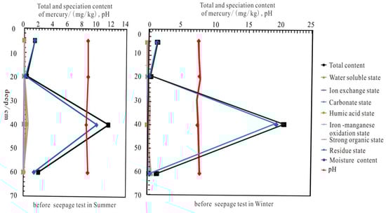 It can be seen from Figure 2 that the stable environment of mercury in the undercurrent zone with pH between 8.39–8.87. The mercury forms in the wet and dry periods are mainly in the residual state, indicating that the source of Hg in the undercurrent zone of the gold mining area mainly is the mineral lattice [], which may be implicated in mining wastewater into the undercurrent zone. The total mercury content (25.22 mg/kg) in the main enriched soil layers in the subsurface in winter was higher than that in summer (11.61 mg/kg). Mercury content displays a negative correlation with pH values. The diagrammatic cross-section in Figure 1e shows that the total amount of mercury in the undisturbed soil and the characteristics of the residue state in the vertical direction of the silt-sand-cobble-tailings-silt-sand-cobble alluvial layer, whether it was the wet season (summer) or the dry season (winter). Furthermore, the high value appears in both 0–10 cm silt containing tailings slag and 30–40 cm silt, however, the highest value is in 30–40 cm silt. In summer, the total and residual contents of mercury in 0–10 cm silt containing tailings were 1.48 mg/kg and 1.45 mg/kg, respectively; the total and residual mercury contents in 30–40 cm silt were 11.64 mg/kg and 10.00 mg/kg, respectively. Kg. Nevertheless, in winter, the total and residual mercury contents in 0–10 cm silt containing tailings are 1.447 mg/kg and 1.445 mg/kg, respectively; the total mercury and residual mercury contents in 30–40 cm sand and pebbles are 19.49 mg/kg and 20.63 mg/kg, to the 40–80 cm sand and pebble layer, this means the total mercury content decreased.