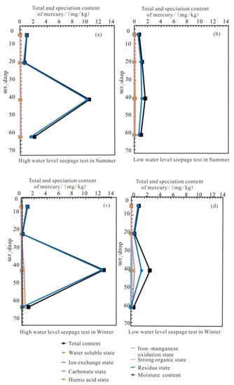 The morphological characteristics of mercury occurrence of the vertical Hg in the subsurface under high and low water level seepage conditions in wet and dry periods (As shown in Figure 3): the mercury content is still mainly in the residual state, and the highest value is in 30–40 cm silt. Furthermore, the mercury content in the stratum in winter is still higher than that in summer, as well as the total and residual mercury content under high-water seepage conditions is higher than the corresponding mercury content. Whereas the total and residual mercury content in wet 30–40 cm silt sand under high water level seepage conditions is 10.21 mg/kg and 9.91 mg/kg, respectively, while the total amount of mercury in 30–40 cm silt sand under low water level seepage conditions in the wet season and residual state were 1.65 mg/kg and 1.14 mg/kg, respectively. On the other hand, the total amount and residual state of mercury in 30–40 cm silt were 13.02 mg/kg and 12.00 mg/kg, respectively, however, the total amount and residual state of mercury under the condition of high and low water level seepage in the dry season in the 30–40 cm silt under the conditions were 3.01 mg/kg and 2.01 mg/kg (as shown in Figure 4).