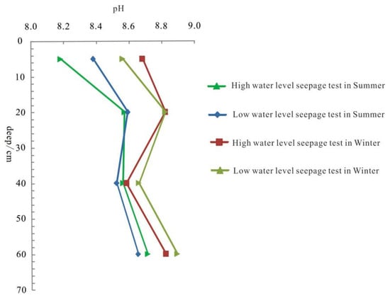 (2) Under the condition of water seepage, the mercury form changes regardless of the dry or the wet season, the various occurrence forms of 0–30 cm mercury in the vertical direction are decreasing, and still the main one. Nonetheless, in the sand and pebble layer, the main forms of mercury are diversified, including residue state, strong organic state, and humic acid state (see Table 3 and Table 4). Currently, the pH of the layer with the largest change in morphological content also tends to be acidified (as shown in Figure 5). Acidic conditions may increase the content of available mercury in the soil, which leads to an increase in its bioavailability and enhanced migration ability. Adsorption-desorption has a great influence on the migration and transformation process. Occasionally, the influence mechanism of soil pH on the complexation-chelation, oxidation-reduction and methylation reactions in the process of mercury migration and transformation is reflected in ion competitive adsorption, valence state change, and methylation reaction, respectively. and promote the synthesis of factors []. The change in humic acid will promote the continuous decrease in water-soluble mercury, exchangeable mercury, and acid-soluble mercury in soil with the increase in alkali-soluble mercury, organically bound mercury and residual mercury []. But to the sand pebble layer, this is because in the disturbed system, almost all forms of mercury have mercury release [].