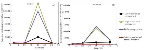 Line chart of potential ecological risks of mercury in the subsurface under changing river water levels. (a)—The line chart of the ecological risk of mercury in the subsurface under the condition of changing river water level in winter; (b)—The line chart of the ecological risk of mercury in the subsurface under the condition of changing the river water level in winter.