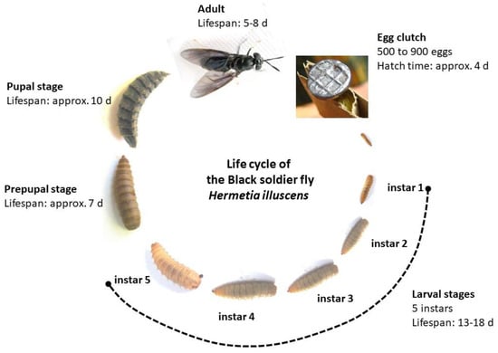 Life cycle of the Black soldier fly Hermetia illuscens, comprising the egg stage, five larval stages (instar 1–5), the prepupal stage, the pupal stage and the imago, modified from de Smets et al. [64] and Lievens et al. [65].