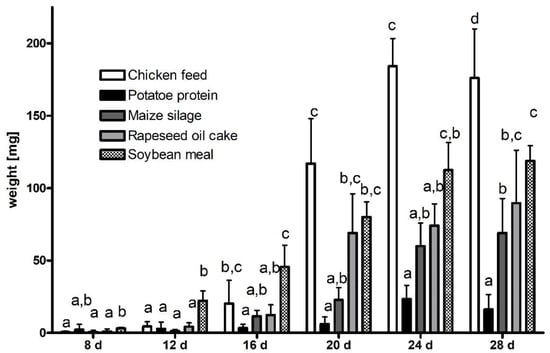 Weight (mean ± SD, n = 10) of Black soldier fly larvae Hermetia illuscens feeding on chicken feed (control), potato protein (P), maize silage (M), rapeseed oil cake (R), soybean meal (S) substrate over an experimental period of 28 d. Significant differences between groups at a given timepoint are indicated by different letters (p > 0.05, n = 10).
