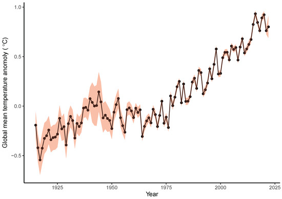 4. Morice, C.P.; Kennedy, J.J.; Rayner, N.A.; Winn, J.; Hogan, E.; Killick, R.; Dunn, R.; Osborn, T.; Jones, P.; Simpson, I. An updated assessment of near-surface temperature change from 1850: The HadCRUT5 data set. J. Geophys. Res. Atmos. 2021, 126, e2019JD032361. [Google Scholar] [CrossRef]