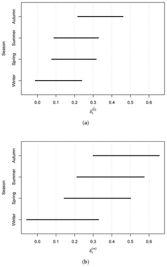 Figure 3. Confidence intervals for parameter estimates: (a) δ ^ λ , s ( k ˜ ) and (b) δ ^ λ , s ( m ) at Newlyn for s = 1 , 2 , 3 , 4 denoting winter, spring, summer and autumn, respectively.