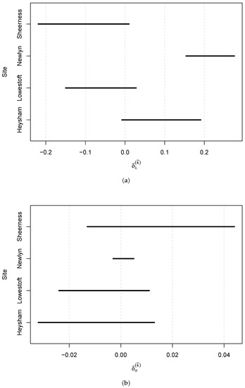 Figure 4. Confidence intervals for parameter estimates δ ^ λ ( k ˜ ) (a) and δ ^ σ ( k ˜ ) (b) for all sites.