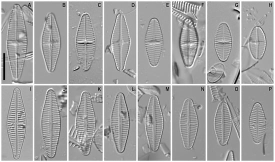 LM, rapheless valves (Figure 1I–P). Valves elliptical to rhombical-lanceolate, ends broadly rounded in longer and somewhat cuneately rounded in shorter specimens. Axial area widely extended transapically. The central area is almost absent and defined by 1–2 shorter striae. Striae uniseriate.