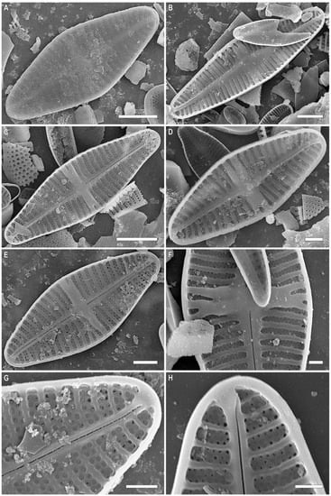 - Kulikovskiy, M.S.; Maltsev, Y.I.; Glushchenko, A.M.; Kuznetsova, I.V.; Kapustin, D.A.; Gusev, E.S.; Lange-Bertalot, H.; Genkal, S.I.; Kociolek, J.P. Gogorevia, a new monoraphid diatom genus for Achnanthes exigua and allied taxa described on the basis of an integrated molecular and morphological approach. J. Phycol. 2020, 56, 1601–1613. [Google Scholar] [CrossRef]