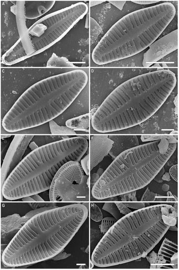 - Krammer, K.; Lange-Bertalot, H. Bacillariophyceae. 3. Teil: Centrales, Fragilariaceae, Eunotiaceae. In Süβwasserflora von Mitteleuropa; Ettl, H., Gerloff, J., Heynig, H., Mollenhauer, D., Eds.; Gustav Fisher Verlag: Stuttgart, Germany, 1991; 576p. [Google Scholar]