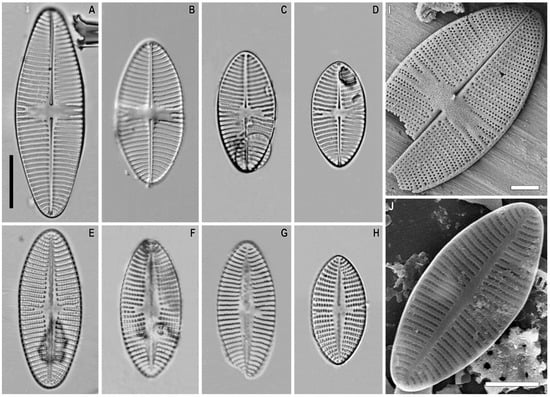 Platesiberia baicalensis (Kulikovskiy & Lange-Bertalot) Kulikovskiy, Glushchenko, Genkal & Kociolek comb. nov. Slide no. 15651m. (A–H). Light microscopy, differential interference contrast, size diminution series. (I,J). Scanning electron microscopy. (A–D,I). Raphe valves. (E–H,J). Rapheless valves. Scale bar (A–H) = 10 μm; (J) = 5 μm; (I) = 3 μm.