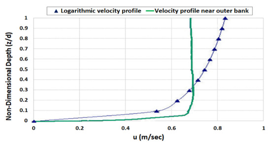 However, Elder’s equation (Equation (5)) is inadequate for application to curved channels because the vertical distribution of the longitudinal velocity does not obey the logarithmic law in the bends of an open channel. The vertical distribution of longitudinal velocity in the bends is shown in Figure 1. As shown in this figure, the maximum velocity occurs near or below the center of the water depth [28]. According to Blankaert [29], Blankaert and de Vriend [30], and Baek and Seo [31], the vertical distribution is more similar to a parabolic function instead of a logarithmic one. Hence, an equation that can describe the vertical velocity distribution of open-channel bends appropriately is to be proposed.