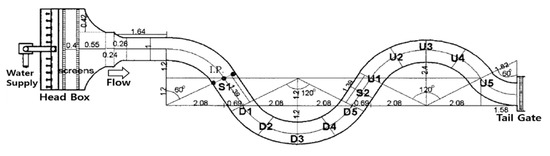 The proposed equations for the vertical velocity distribution and dispersion coefficient were compared and verified with the values measured from two different types of open channels, i.e., a small-scale laboratory channel and a mid-scale natural-like channel. The sinuosity of the laboratory channel in which the hydraulic experiment was performed was 1.32, and a schematic plan view is shown in Figure 3 [3]. As shown in this figure, the width of the channel was 1 m; meanwhile, alternating curvatures with a central angle of 120° at the center, as well as additional curvatures with a central angle of 60° at the inlet and outlet were present. The cross-section of the channel was rectangular, and a smooth bed was implemented using painted steel. Micro-acoustic Doppler velocimetry (ADV) was used to measure the flow structure; micro-ADV is a high-precision velocimetry method that measures a three-dimensional flow field. The flow velocity measurements were performed on 12 sections of the channel, as shown in Figure 3. Three cases (Cases 301, 303, and 402) of velocity field measurement were conducted based on the flow conditions in which the flow rate was varied from 0.03 to 0.09 m3/s [31]. Tracer tests were performed under the same flow conditions to elucidate the dispersion characteristics. A salt solution (NaCl) was used as the tracer.