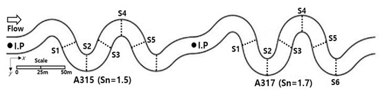 A mid-scale nature-like channel was implemented at the Andong River Experiment Center, operated by KICT (Korea Institute of Construction Technology) in Korea. Three reaches with different sinuosity were connected in series, as shown in Figure 4 [37]. The bottom of the channel was composed of sand, and the cross-section of the channel exhibited a natural shape arising from the water flow. The length of the channel was 134 m for 1.5 sinuosity (A315 reach) and 155 m for 1.7 sinuosity (A317 reach). The three-dimensional flow field was measured using an acoustic Doppler current profiler at six sections of the channel, as shown in Figure 4. The average flow rate was 1.45 m3/s, and the average water depth was 0.487 m in the channel. The average cross-sectional velocity was measured to be 0.49–0.64 m/s in the A315 reach and 0.39–0.47 m/s in the A317 reach. A fluorescent substance (rhodamine WT) was used as the tracer in the mixing experiment. The tracer was released at the injection point (shown in Figure 4) in each reach.