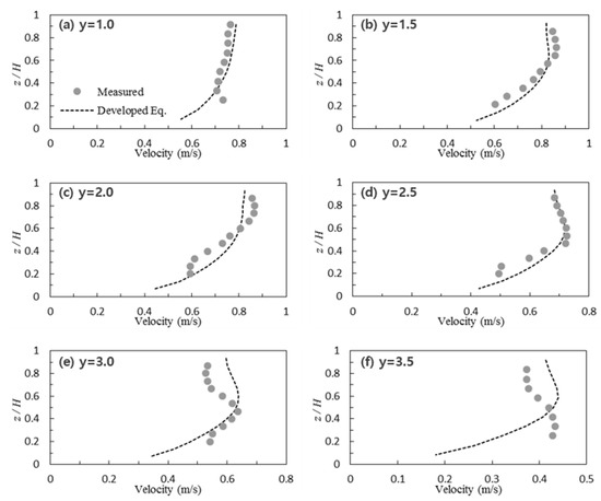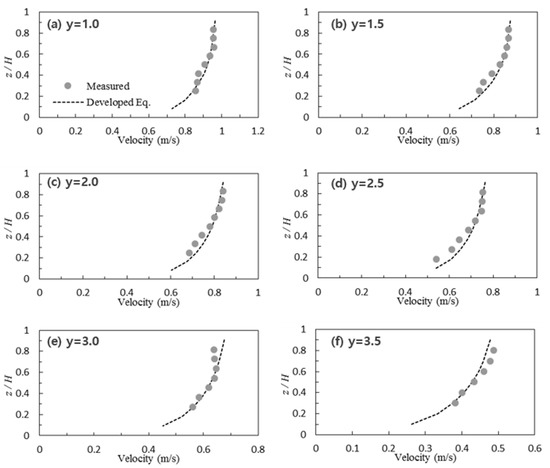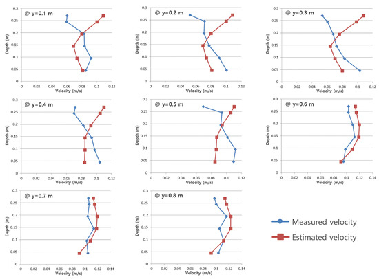 Figure 7 and Figure 8 show a comparison between the velocity obtained using the proposed equation and the measured velocity for each vertical section in the nature-like channel. By applying the proposed equation to the channel, the velocity distribution equation for each section was discovered to be relatively consistent with the measured values, and showed a higher applicability than the existing logarithmic formula.