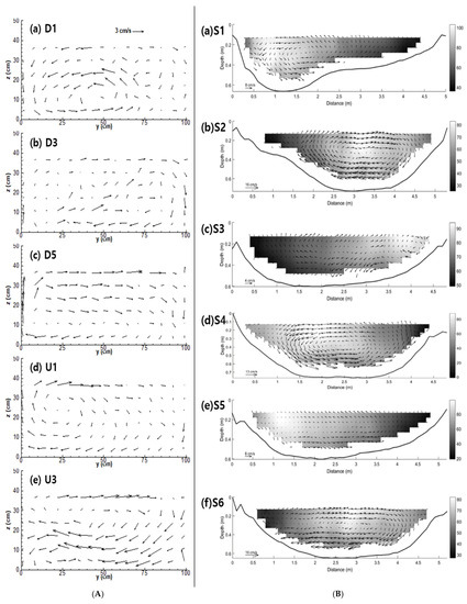 As show in Figure 5, the vertical distribution of the longitudinal velocity near the left bank of Section U1 was severely distorted, such that the velocity near the bottom was almost twice that of the water surface. By contrast, the vertical distribution near the right bank exhibited a typical shape. It can be confirmed from Figure 6A that a strong rotating cell was generated on the left side of Section U1.