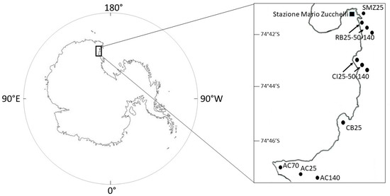 In the austral summer of 2015, during the 30th Antarctic Expedition (PNRA, Italian Research Program in Antarctica), sediment samples were taken from Terra Nova Bay. The sampling program was carried out aboard the MS “Malippo” in January 2015, and sediment samples were collected with a Van Veen grab (surface 0.18 m2) from 11 stations at 25, 70, and 140 m depth (Table 1) at increasing distance from the SMZ (Figure 1). In particular, one station was located in front of the Stazione Mario Zucchelli (SMZ25), three stations at Rod Bay (2 km south of the base; RB25, RB70, RB140), three stations at Camp Icarus (4 km south of the base; CI25, CI70, CI140), one station at Central Bay (7 km south of the base; CB25), three stations at Adelie Cove (10 km south of the base, AC70, AC25, AC140). At each station, the sediments were collected in three independent replicates, except for the stations CB25 and SMZ25, where adverse weather conditions allowed the collection of only two replicates. Three Plexiglas cores were retrieved from independent grab casts in each station for texture and biochemical analysis and immediately stored at −20 °C. At SMZ, the sediment grabs were sieved through 0.5 mm mesh, fixed in ethanol, stored at −20 °C, and sent to Italy by ship at the end of the campaign.