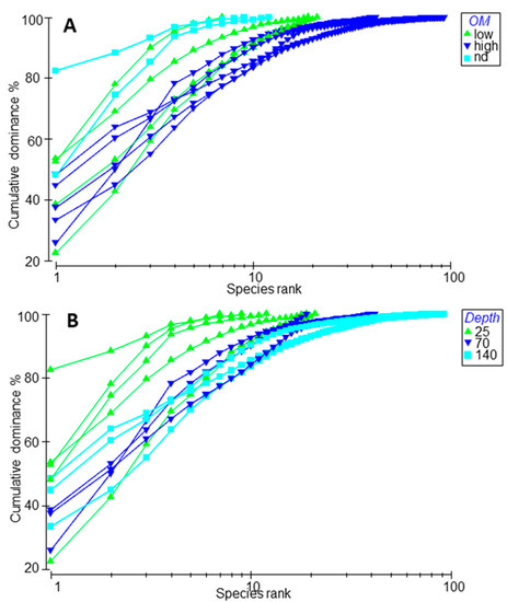 K-dominance curves for each analysed station show differences in OM (A) and depth (B) percentages.