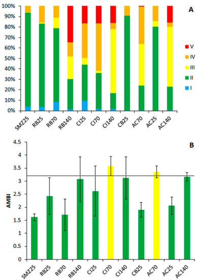 The percentage of invertebrates belonging to the different ecological groups was then calculated for each station. The AMBI values were calculated using the corresponding software (http://ambi.azti.es; accessed 30 June 2019). The stations were classified according to the following thresholds for status classification: “undisturbed” if AMBI < 1.2, “slightly disturbed” if 1.2 < AMBI ≤ 3.3, “Moderately disturbed” if 3.3 < AMBI ≤5, “heavily disturbed” if 5 < AMBI ≤ 6, and “extremely disturbed” if AMBI ≥ 6 [3].