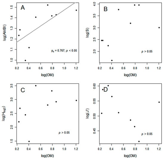 The values of AMBI showed the best response to increasing concentration of organic matter (Figure 4A). Conversely, richness (Figure 4B), diversity (Figure 4C), and equitability (Figure 4D) did not show significant correlations with the concentration of organic matter.