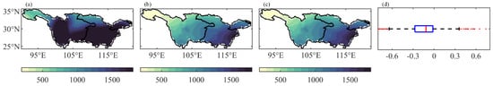 Mean annual precipitation (mm/a) in the Yangtze River basin from 1981 to 2010: (a) ACCESS-CM2, (b) corrected ACCESS-CM2, (c) observation, (d) the absolute value of the difference between the corrected model and observed annual mean precipitation (mm).