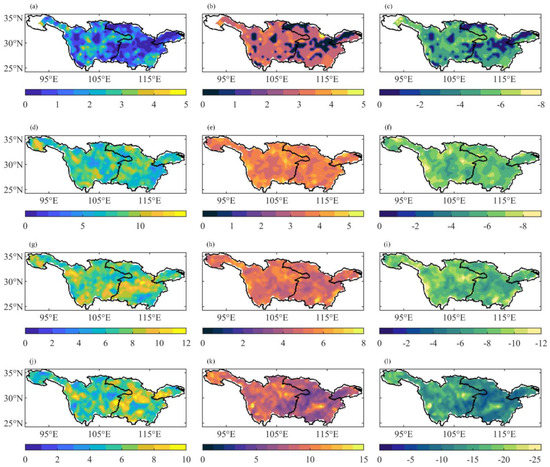 Drought Characteristics in the Yangtze River basin from 1981 to 2010 in the 1-month (a–c), 3-month (d–f), 6-month (g–i) and 12-month (j–l) scale, with the first column showing the number of drought events, the second showing the average duration (month), and the last showing the average severity.