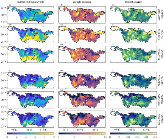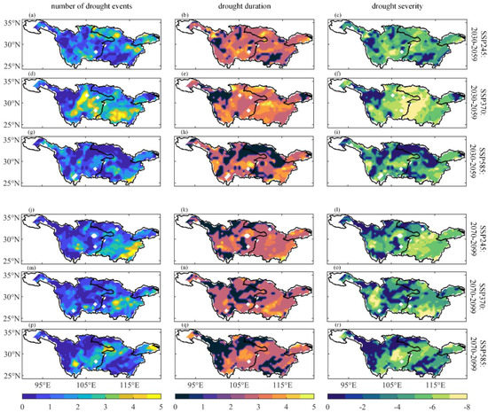 Spatial distribution of the number of drought events (a,d,g,j,m,p), average duration (b,e,h,k,n,q), and average severity (c,f,i,l,o,r) in the 6-month scale in the Yangtze River basin from 2030–2059 (a–i) and 2070–2099 (j–r) under the three scenarios of SSP245 (a–c,j–l), SSP370 (d–f,m–o), and SSP585 (g–i,p–r).