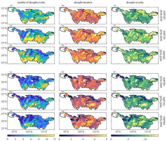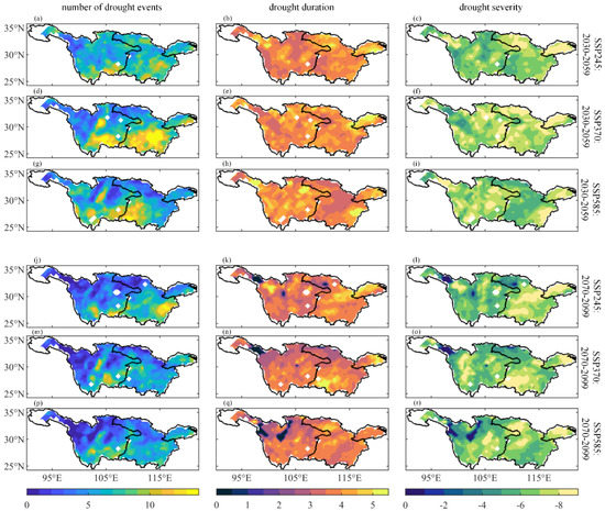 For the 6-month scale, the spatial distributions of drought frequency, mean duration, and intensity (Figure 6) are very similar to those of the 3-month scale. In addition, the differences are mainly in the northern midstream in the near future under the SSP370 scenario and the central midstream in the far future under the SSP245 scenario. These areas are all of higher severity in the 3-month time scale, while their severity is low in the 6-month scale.