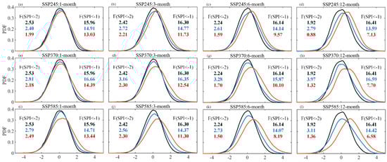Probability distributions of 1-month (a,e,i), 3-month (b,f,j), 6-month (c,g,k), and 12-month (d,h,l) scale SPI under SSP245 (a–d), SSP370 (e–h), and SSP585 (i–l) scenarios. The black, blue, and red lines represent the probability distributions for the historical period (1981–2010), 2030–2059, and 2070–2099, respectively, and the black, blue, and red letters represent the probabilities (%) of SPI < −2 and SPI < −1 for the corresponding periods.