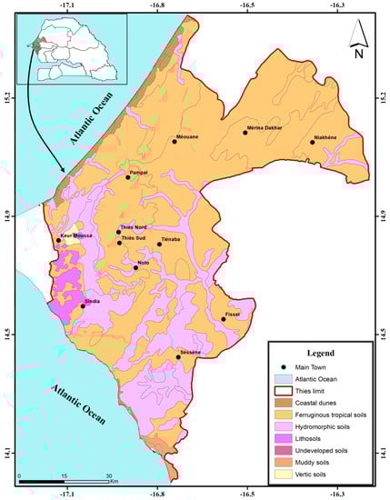 Geologically, the Thies region belongs to the Senegalese-Mauritanian basin, whose sedimentary formations start from the Trias–Lias to the Quaternary without interruption. The lithostratigraphic description of this region begins from the Upper Cretaceous with the Maastrichtian formations until the late Quaternary deposits. This description is essentially based on data from geological profiles, water and especially hydrocarbon exploration, and on the synthesis of published studies by [,,,,,].